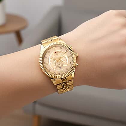 GENOA TIME V2 Miyota 2115 Quartz 3ATM WR Dragon Pattern & Crystal Dial & Gold Case Mens Watch with Gold Stainless Steel Strap