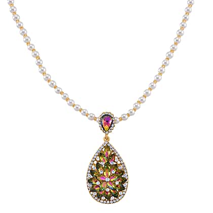 Bring refined detail and vibrant artistry together with the Yellow Glass Beads & White Glass Pearl Necklace, a design that balances soft pearl beauty with a striking decorative centrepiece. The necklace features a smooth strand of white glass pearls, accented with subtle yellow beads that add warmth and visual rhythm. The teardrop pendant stands out with an intricate arrangement of white crystals and multicolour elements, forming a detailed, floral-inspired pattern. A green magic colour crystal adds contrast, enhancing the overall composition with a bold focal point. The gold-tone setting frames the design, giving it a polished and cohesive finish. Ideal for occasion wear, festive styling, and adding a detailed statement to stunning looks.