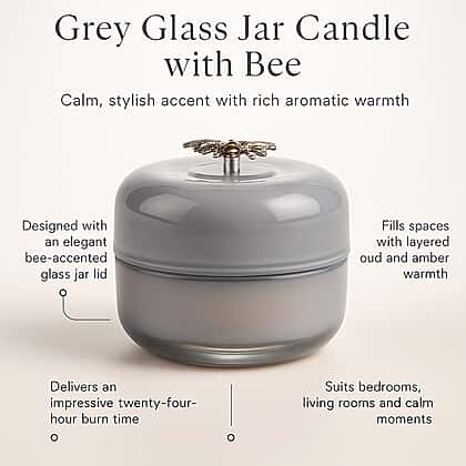 This grey glass jar candle adds a calm and stylish accent to any room, lifted by its decorative bee-detail lid. Made with 120g of paraffin wax and 3% carefully blended fragrance, it offers a steady twenty-four-hour burn. The scent opens with vanilla, tonka bean and vetiver before moving into a warm heart of cardamom, pepper and amber. Its base of oud wood, Brazilian rosewood and sandalwood creates a serene, grounding finish that feels perfect for unwinding. Whether you’re creating a soothing evening atmosphere or looking for a thoughtful gift, this candle brings a gentle and inviting aromatic experience.