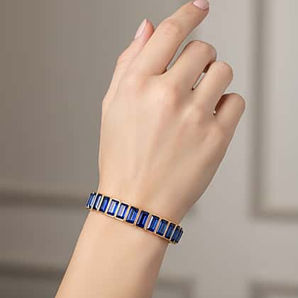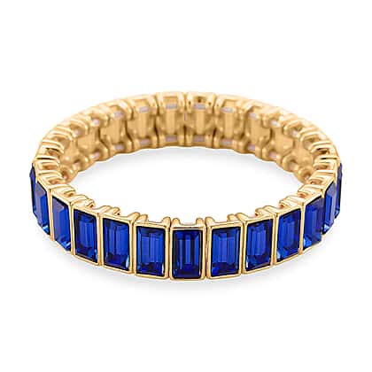 A bold infusion of deep colour and shine, this bracelet features rectangular blue glass stones that deliver a rich, saturated tone with a striking reflective finish. The darker blue hue creates a strong visual contrast, allowing each stone to stand out while forming a continuous band of brilliance. Precisely aligned, the stones create a clean and consistent look that wraps seamlessly around the wrist. Set in a yellow gold-tone finish, the design enhances warmth while intensifying the depth of the blue. The stretchable fit ensures effortless wear and flexibility, combining comfort with a confident, statement-making presence.