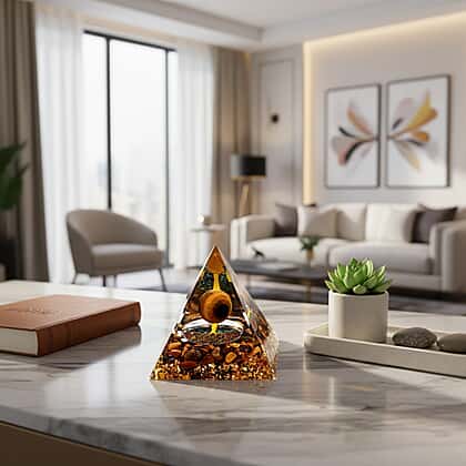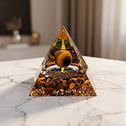 Bring warmth and brilliance to your decor with this handcrafted crystal pyramid ornament in gold and transparent tones. Measuring 6cm, this compact piece features shimmering golden elements encased within a clear pyramid structure, creating a striking visual effect from every angle. The geometric form reflects light beautifully, adding a radiant glow to desks, shelves or coffee tables. Its stunning blend of gold and clarity complements both modern and classic interiors. Ideal for gifting or enhancing your personal space, this ornament offers a refined decorative accent in a small yet impactful design.