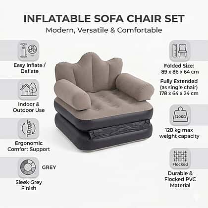Experience comfort that adapts to your space with this inflatable reclining sofa bed, designed for relaxed lounging and practical versatility. The cushioned seating offers a supportive feel, while the extended base transforms easily into a laid-back resting position. Finished in a neutral grey tone, it blends seamlessly into both indoor and outdoor settings. The lightweight, inflatable construction allows for quick setup and easy storage, making it ideal for flexible living. Whether used for casual seating, reading, or occasional sleeping, this design delivers convenience without compromising on comfort.