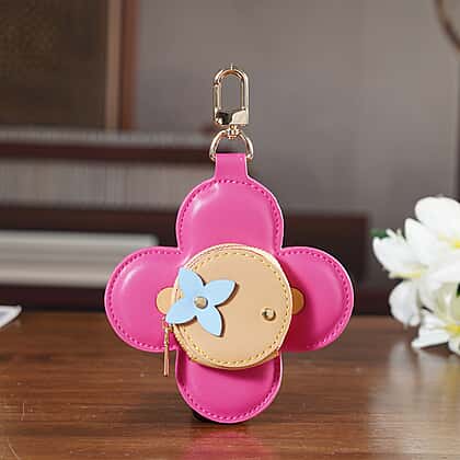 Genuine Leather Flower Keychain Bag Charm - Zipped Mini Coin Purse - Pink & Khaki
