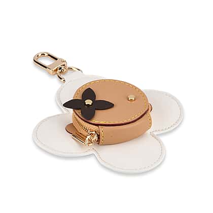Genuine Leather Flower Keychain Bag Charm - Zipped Mini Coin Purse - White & Khaki