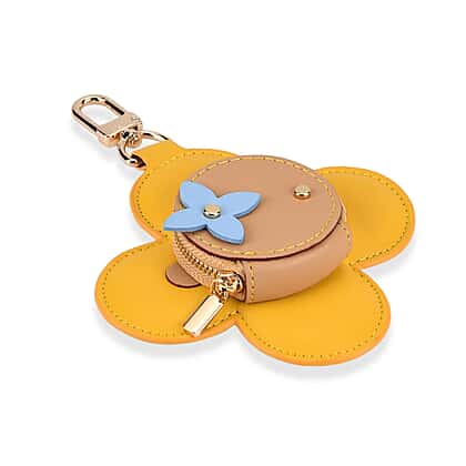 Genuine Leather Flower Keychain Bag Charm - Zipped Mini Coin Purse - Yellow & Khaki