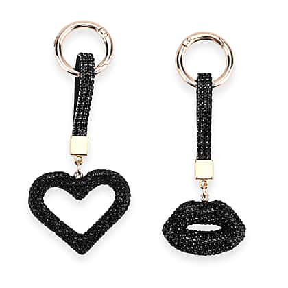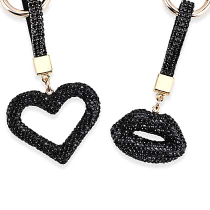 Designer Inspired - Set of 2 Sparkling Heart & Lip Shaped Keychains- Charms in Yellow Gold Tone - Black