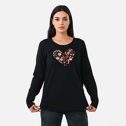 Refresh your everyday style with this cotton full sleeve T-shirt, featuring floral heart embroidery that adds a soft, decorative touch. Set against the black base, the colourful design stands out beautifully, bringing a lively contrast to a classic design. Crafted from breathable cotton, the fabric feels soft on the skin and is ideal for all-day comfort. The full sleeves and relaxed fit provide ease of movement, making it a practical choice for both casual and slightly dressed-up looks. The embroidered heart detail adds a charming focal point, giving the T-shirt a distinctive finish while keeping it easy to style with jeans, trousers, or skirts. Perfect for daily wear, casual outings, or adding a touch of detail to your wardrobe essentials.