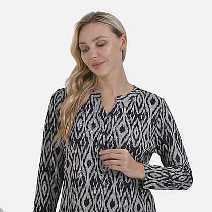 Upgrade your everyday wardrobe with this La Marey rhinestone embellished notch-neck tee, designed for both comfort and style. The elegant V-neckline with a subtle button detail offers versatility—wear it buttoned for a neat, refined look or unbuttoned for a relaxed appeal. The striking geometric print adds a modern touch, making it an eye-catching choice for any casual or semi-formal occasion. Crafted from soft, breathable fabric, this blouse provides all-day ease, while the full sleeves make it ideal for layering or wearing on its own. Pair it effortlessly with jeans, trousers, or skirts for a smart yet comfortable ensemble.