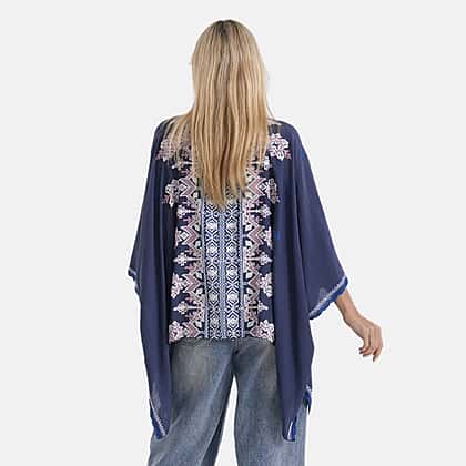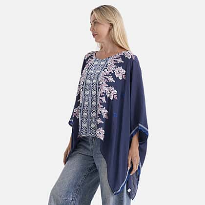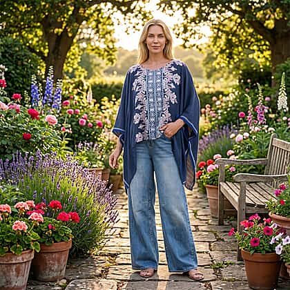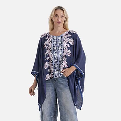 Add a relaxed yet stylish layer to your wardrobe with this full embroidery kaftan top, designed for comfort and effortless wear. Finished in a dark blue tone, it features intricate all-over embroidery that brings a detailed and eye-catching touch to the look. The loose, flowy design drapes beautifully, offering ease of movement and a flattering fit for all body types. Wide sleeves enhance its laid-back feel, while the lightweight fabric makes it perfect for layering over casual outfits. Whether paired with jeans or worn on holiday, this kaftan top delivers a blend of comfort and standout design.