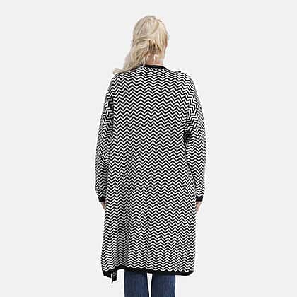 Presenting a perfect fashion statement, suitable for layering on any outfit. This La Maréy long cardigan is an ideal fusion of style and comfort. The striking black and off white colour catches attention, and its chevron-inspired design makes it a perfect piece for cooler days and the winter season. Crafted from premium, soft, and breathable material, it offers coziness and durability. The piece beautifully drapes around the shoulder, giving you a flattering fit. The open front desk makes it easy to style over any outfit, making it suitable for everyday wear, whether it's casual or formal.