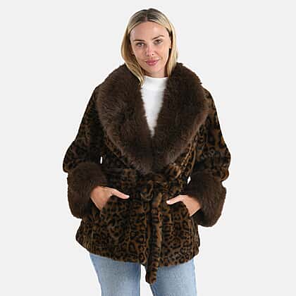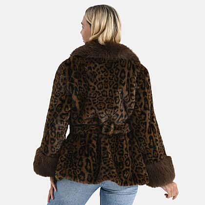 La Marey Luxury Leopard Print Belted Faux Fur Coat (One Size up to size 20 ) - Brown