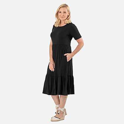Soft drape and everyday ease define this La Marey Women's Tiered Stretch Waist Midi Dress in black. The breathable viscose-elastane blend gives you gentle stretch, while the tiered skirt adds movement without feeling bulky. A flexible stretch waist creates a flattering fit, and the practical side pockets make it ideal for days when you want comfort without losing style. Finished with short sleeves, a scoop neckline and a graceful midi length, it’s the kind of dress you reach for when you crave comfort, ease and simple confidence.
