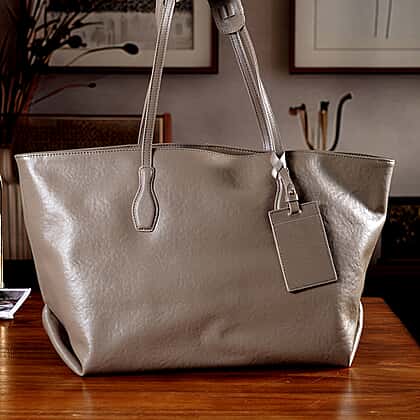 Carry more with ease using this leather patterned tote bag, designed to combine spacious functionality with a clean, structured look. Crafted from leather, it features a subtle textured finish that enhances durability while maintaining a refined appearance. The soft khaki tone adds a neutral, versatile touch, making it easy to pair with a wide range of outfits. The large interior offers ample space for daily essentials, work items, or travel needs, with inner compartments to help keep everything organised. Sturdy shoulder handles provide comfortable carrying, while the open-top design allows for easy access, making it ideal for everyday use.