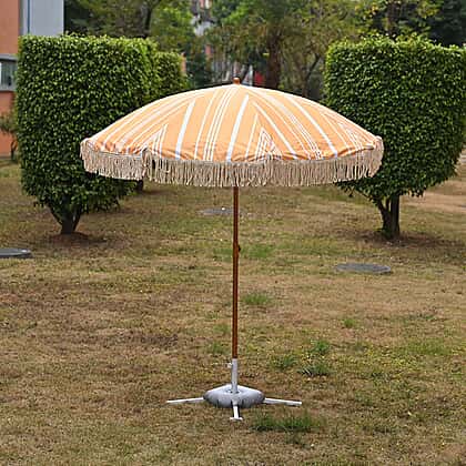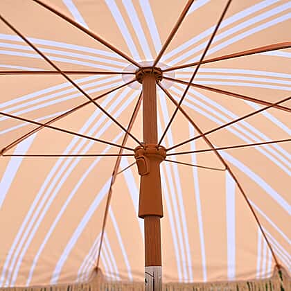 Refresh your outdoor setting with this 2 m stripe pattern round parasol, designed to combine visual warmth with everyday practicality. The striped canopy introduces a soft, summery character while providing reliable coverage from direct sunlight. Crafted with a sturdy frame and supported by an iron base, it offers stability for regular garden use. The waterproof fabric adds resilience against light showers, making it suitable for changing outdoor conditions. With its balanced structure and considered detailing, this parasol creates a comfortable shaded space for relaxing, dining or entertaining outdoors.