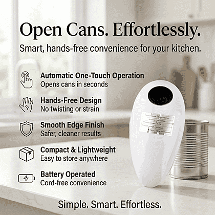 Simplify your kitchen routine with the Livmore automatic can opener in white. Designed for effortless use, this compact device opens cans smoothly at the touch of a button. Simply position it on top of the can, press to activate and allow it to rotate automatically for a clean and easy cut. Its lightweight, ergonomic design makes it comfortable to handle and easy to store in drawers or cupboards. Ideal for reducing strain on hands and wrists, it offers practical convenience for everyday cooking. A smart and reliable addition to any modern kitchen.