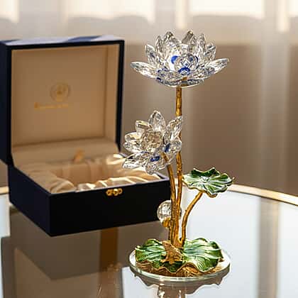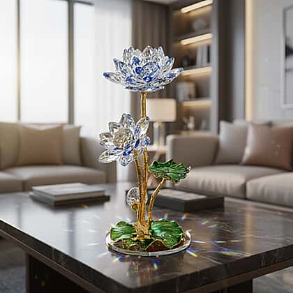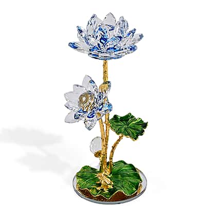 Bring a touch of artistic beauty to your home with the Livmore crystal lotus flower ornament in blue and green. Featuring beautifully cut crystal petals in soft blue tones and detailed green leaves, this decorative piece captures light to create a radiant display. The gold-tone stem and base enhance its refined appearance, making it suitable for coffee tables, shelves or display cabinets. Inspired by the symbolism of the lotus, it represents purity and renewal while adding decorative charm to your interior. A striking accent piece that blends colour, craftsmanship and visual appeal for any home setting.