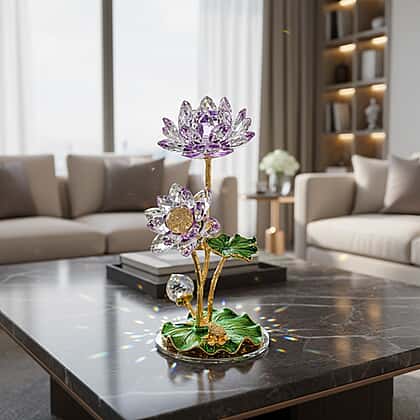 Enhance your interior with the Livmore crystal lotus flower ornament in purple and green. Featuring delicately faceted purple crystal petals paired with detailed green leaves, this decorative piece captures and reflects light beautifully. The gold-tone stem and base add contrast and visual appeal, making it ideal for coffee tables, display cabinets or shelves. Inspired by the symbolism of the lotus, it represents renewal and positivity while adding artistic interest to your home. Whether styled as a standalone accent or combined with other decor pieces, it brings colour and charm to any setting.
