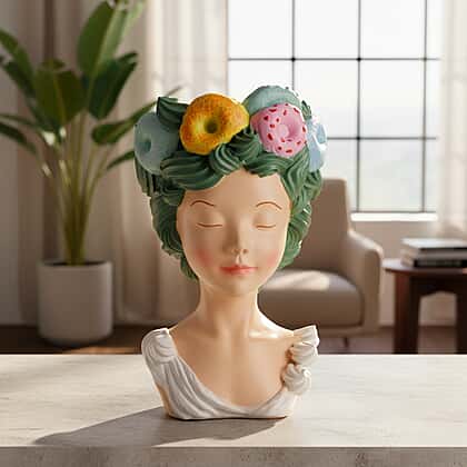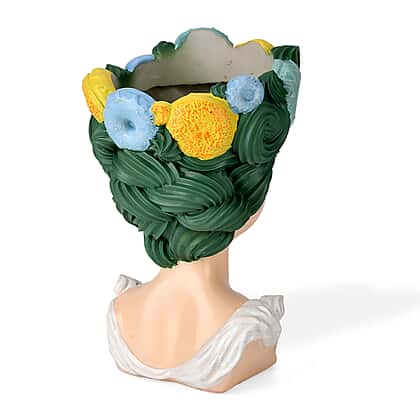 Bring artistic character to your space with this lady head planter, designed to blend decor with functionality. The sculpted face features a serene expression, while the green hair forms a textured planter, adorned with colourful floral accents for added visual interest. Crafted to hold small plants or succulents, it creates a distinctive display that enhances both indoor and outdoor settings. The compact size makes it suitable for tabletops, shelves, or garden corners, adding personality without overwhelming the space. Combining decorative detail with practical use, this planter offers a creative way to showcase greenery.