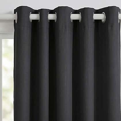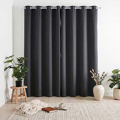Create a more controlled and comfortable indoor environment with this set of two black curtains, designed to reduce incoming light effectively. Made from coated microfibre fabric, they help limit external brightness while supporting privacy in your living space. The smooth texture allows the fabric to fall neatly, giving a clean and structured appearance to windows. Fitted with metal eyelets, they are easy to hang and glide smoothly along curtain rods. Suitable for bedrooms or living areas, they combine functional light control with a simple, modern finish.