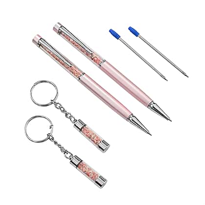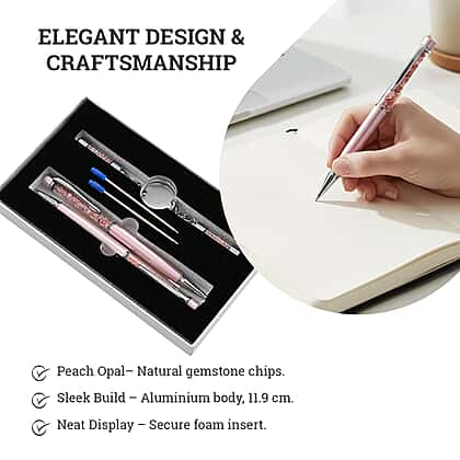 LIVMORE Luxury Set of 2 Peach Opal Filled Pens With Refills and 2 Peach Opal Filled Key Chains- Charms