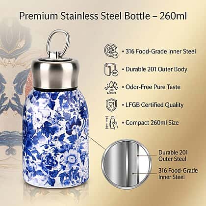Designed for everyday hydration, this art-print water bottle features a detailed blue and white floral pattern that adds a clean and classic visual appeal. Crafted from stainless steel, it offers a durable structure suitable for regular use while supporting a safe and hygienic drinking experience. The 260 ml capacity provides a compact format that fits easily into handbags, backpacks or side pockets. A secure screw-top lid helps minimise the risk of leaks during movement, and the smooth inner surface supports easy cleaning. Lightweight and practical, it is well-suited for daily routines, travel or work use.
