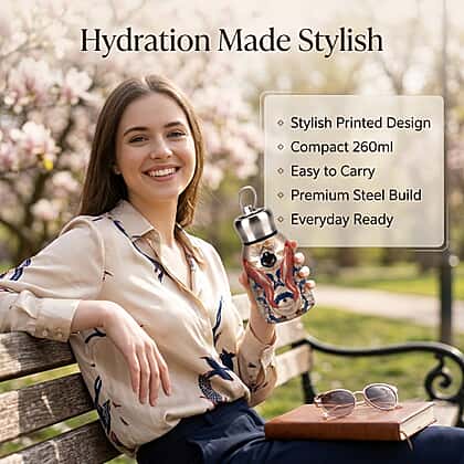 Stay refreshed throughout the day with this art-print water bottle, designed with a detailed fish motif that adds a distinctive visual appeal. Crafted from stainless steel, it offers a durable and reliable structure suitable for everyday use. The compact 260 ml capacity makes it easy to carry in handbags or backpacks, while the secure screw-top lid helps prevent leaks during movement. Its smooth inner surface supports clean and hygienic use, making it suitable for regular hydration needs. The lightweight build ensures convenient handling whether at home, work or while travelling.