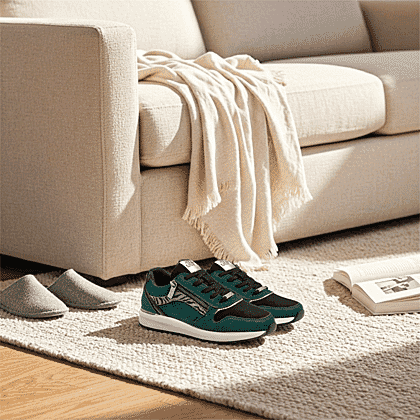 - Smooth leather upper in green and black.