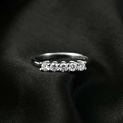 A smooth silver-toned band holds a row of 5 bright lab-grown diamonds, each stone raised in an open setting that allows light to flow freely through the design. The stones sit in a graceful arc, creating a clean line of radiance that catches the eye with every movement. Five-stone rings are often linked with balance, strength and meaningful milestones, giving this piece a touch of symbolism alongside its bright structure. Crafted in rhodium overlay, the piece offers a mirror-like shine and a polished finish. The hypoallergenic 925 sterling silver provides comfort and safety for sensitive skin. The open gallery beneath each stone brings depth and dimension, shaping a ring that feels light, expressive and beautifully crafted.