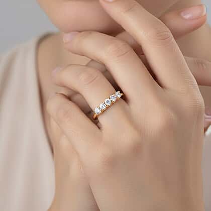 A smooth yellow-toned band holds a row of 5 bright lab-grown diamonds, each stone raised in an open setting that allows light to flow freely through the design. The stones sit in a graceful arc, creating a clean line of radiance that catches the eye with every movement. Five-stone rings are often linked with balance, strength and meaningful milestones, giving this piece a touch of symbolism alongside its bright structure. Crafted in 18K yellow gold vermeil plating, the piece offers luxurious appeal and polished shine. The hypoallergenic 925 sterling silver provides comfort and safety for sensitive skin. The open gallery beneath each stone brings depth and dimension, shaping a ring that feels light, expressive and beautifully crafted.