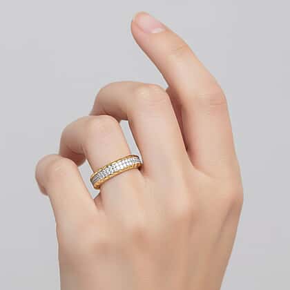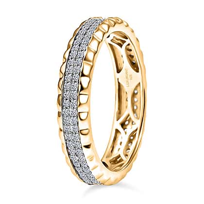 This mesmerising band ring features a whole row of bright lab-grown diamonds offering brilliance and icy fire, which catches light from every angle. The stones sit closely together to form a smooth, continuous line of light, while the detailed inner gallery creates a striking contrast between radiance and rich gold tone. Meticulously crafted in hypoallergenic 925 sterling silver, this piece ensures durability and comfort to sensitive skin. The glossy 18K yellow gold plating offers a warm tone, shine, and a shiny finish. Lab-grown diamonds offer purity, brilliance and strength, making this band a meaningful symbol of clarity, unity and commitment. The premium finish enhances the brightness of the stones, shaping a piece that feels luxurious, suitable for showcasing love and commitment.