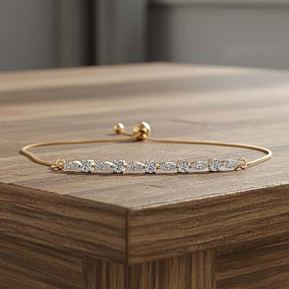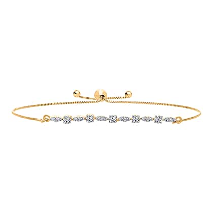 Discover a treasure of brilliance with this bracelet, featuring a graceful sequence of round and marquise stones, creating a fluid line of light, giving the piece a distinguished, radiant presence. The adjustable slider moves with precision for a tailored fit, while the polished finish heightens its luxurious appeal. A beautifully curated design made for those who seek depth, detail, and a high-value addition to their collection. Crafted in 18K vermeil yellow gold plating, this piece offers a warm tone finish and luminous shine. The hypoallergenic 925 sterling silver provides durability and comfort to sensitive skin. Finished with a secure slider clasp, this bracelet offers comfort and security. Give your wrist a touch of brilliance with this stunning bracelet, perfect for enhancing any ensemble and special gifting.