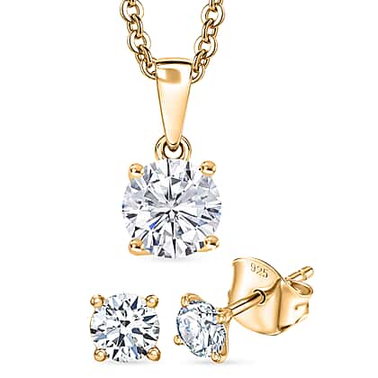 Ethical sparkle meets modern simplicity in this moissanite pendant and stud earring set. This jewellery set is designed for those who appreciate jewellery that speaks softly yet leaves an impression. Each piece features a round-cut moissanite placed in a classic four-prong solitaire setting, allowing the brilliance of the stone to take centre stage. The yellow gold plated sterling silver finish adds warmth and polish, creating a look that feels effortlessly refined.The round-cut enhances the stone’s fire and clarity, reflecting light with captivating brilliance while maintaining a clean, minimal silhouette. This moissanite jewellery set is perfect to achieve a coordinated look, yet each piece can be worn separately for everyday styling.