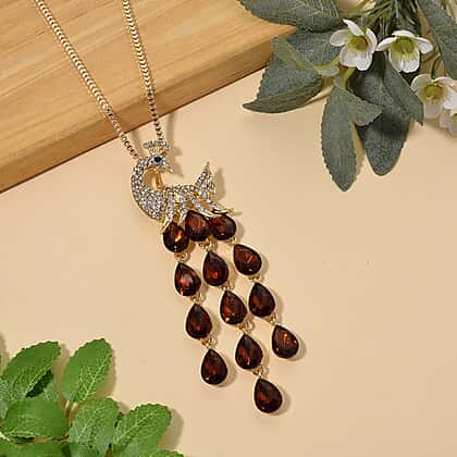 Introducing a peacock-inspired necklace that captures a sense of quiet splendour in motion and form. The design begins with a delicately shaped bird, its curved neck and crest traced in fine, light-catching stones, leading into a sculpted arrangement that suggests feathers unfolding with measured grace. The piece descends into a striking cascade of deep-toned teardrop crystals. Rich and warm in hue, each drop holds a burnished glow, reminiscent of amber and garnet that brings depth and intensity to the composition. Crafted in a gentle sequence, the stones create a rhythmic fall that draws the eye downward, adding movement and presence without excess. The yellow gold tone setting enhances this warmth, enriching the darker crystals while maintaining balance throughout the design. Worn along the neckline, the pendant settles with ease, supported by an adjustable chain that allows for subtle variation in length and styling. A piece that feels both expressive and composed, it offers a refined take on a classic motif, making it suitable for special gifting and distinctive styling.
