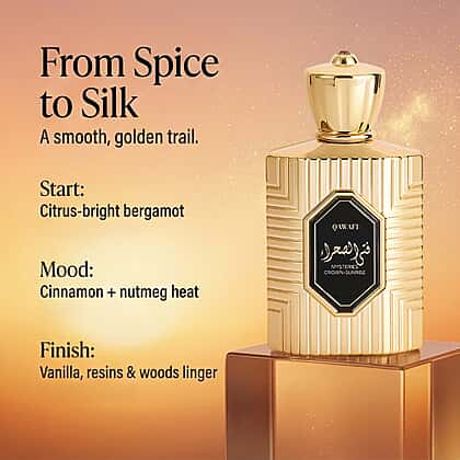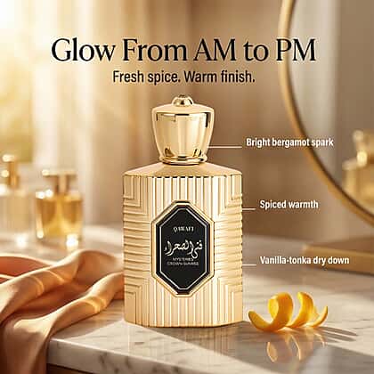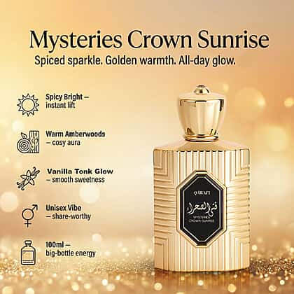 With a radiant, comforting feel, QAWAFI Mysteries Crown Sunrise Eau de Parfum captures the warmth of early light in a scent. Spiced cinnamon, nutmeg and bergamot open with energy, gently melting into a sweet heart of dates, praline, tuberose and mahonial. The base is rich and embracing, blending vanilla, tonka bean, amberwood, myrrh, benzoin and akigalawood for depth that feels smooth and reassuring. Housed in an ornate gold bottle, this 100ml fragrance feels special from first spray to dry down. Perfect for daytime wear, it suits those drawn to cosy, softly expressive perfumes with lasting warmth.