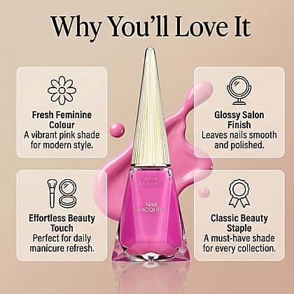 Add a vibrant touch of colour to your manicure with this Joan Collins nail lacquer. The formula delivers rich pigmentation that glides smoothly across the nails, creating an even and flawless finish. This lively pink shade brings a fresh and playful look while maintaining a polished appearance suitable for both everyday styling and special occasions. Designed to provide long-lasting colour and glossy shine, the lacquer enhances the overall look of your nails with minimal effort. Presented in a signature Joan Collins bottle with an stunning gold cap, this nail lacquer reflects glamour, sophistication, and timeless beauty in every detail.