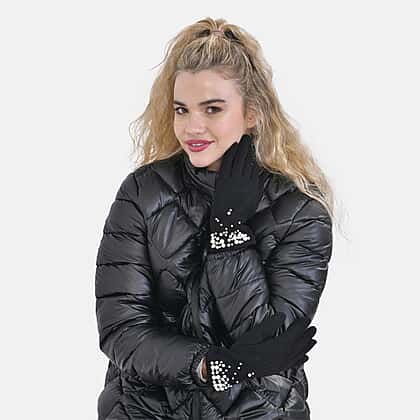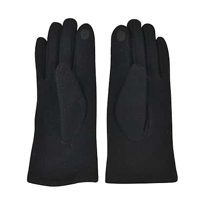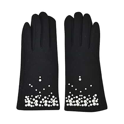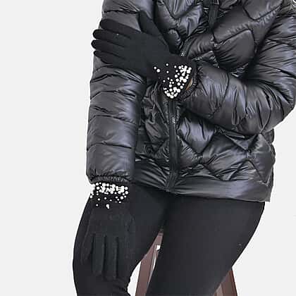 Cashmere Gloves Decorated with Shiny Beads & Touch Screen Function - Black
