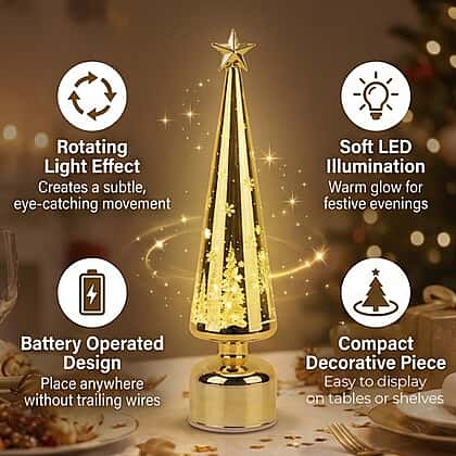 Add a warm seasonal accent to interior spaces with this rotating LED Christmas tree light, designed to introduce gentle movement and a soft festive glow. Shaped like a classic Christmas tree, the gold finish is highlighted by rotating LED lighting that brings depth and visual interest when illuminated. Battery operated for convenience, it can be placed on tables, shelves, or sideboards without the need for cables. Compact yet decorative, this piece helps create a cosy festive mood while remaining easy to use and simple to display.