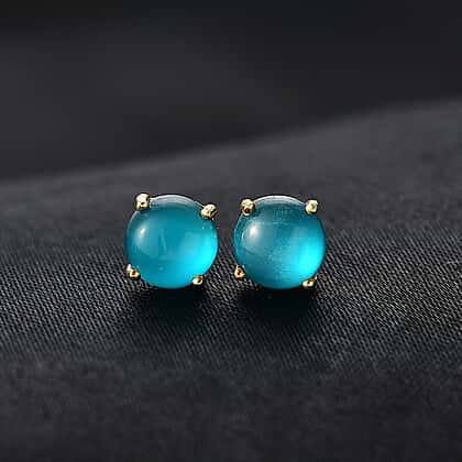 These stud earrings showcase a stunning Paraiba moonstone that captivates both the heart and the eyes with its oceanic blue hue. Crafted in yellow gold plating on 925 sterling silver, these earrings ensure lasting durability and luxurious polished shine. The smooth, vibrant blue moonstone creates a striking focal point, offering a pop of colour that stands out with every turn. The simple yet classy design is complemented by a secure push-back post, ensuring comfort and ease of wear. Perfect for adding a subtle touch of sophistication to any look, these earrings are a versatile addition to your jewellery collection, ideal for both everyday wear and special occasions.