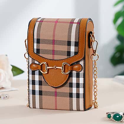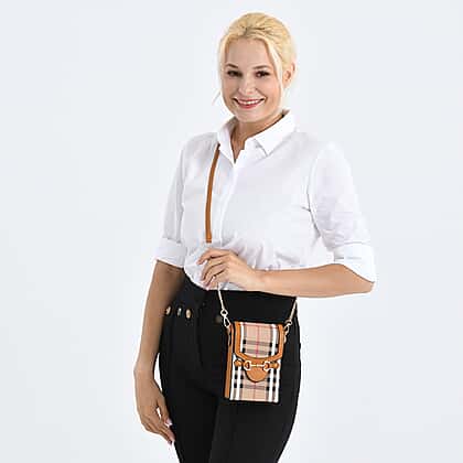 Checkered Pattern Wallet Style Sling Bag with Shoulder Strap (135cm) - Light Brown