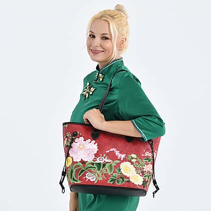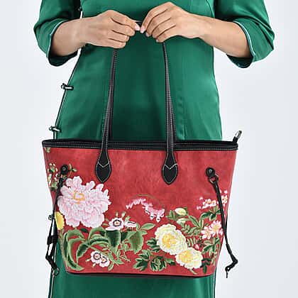New Launch-Floral Embroidered Tote Bag - Red