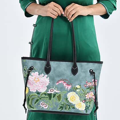 Floral Embroidered Tote Bag - Blue