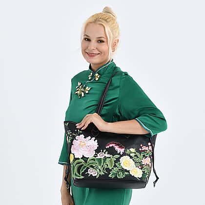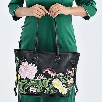 Floral Embroidered Tote Bag - Black