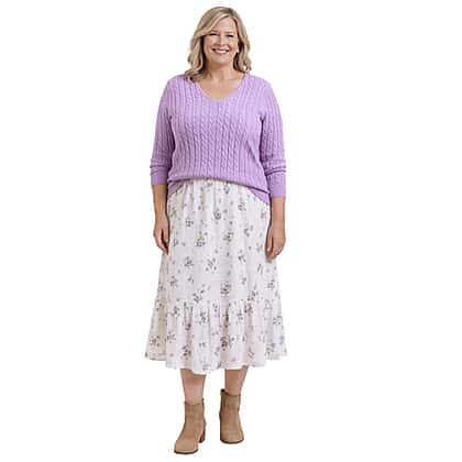 Wrap yourself in everyday comfort with the Pure and Natural V-Neck Cable Jumper in lilac shade. Designed with a classic cable knit texture, this jumper offers a soft, cosy feel while maintaining a polished appearance. The flattering V-neckline creates a lengthening effect, making it easy to layer over shirts or wear on its own. Crafted for a relaxed fit, it provides comfortable coverage without feeling bulky. Ideal for cooler days, it pairs effortlessly with jeans, trousers or skirts. Versatile and easy to style, this jumper is a dependable wardrobe essential for casual and smart-casual dressing.