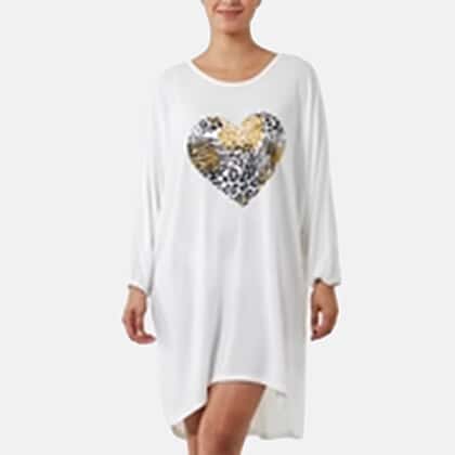 Designed with a loose fit design, this tunic top offers ease of movement and all-day comfort. The soft fabric drapes gently, creating a fluid shape that feels relaxed against the skin. A statement animal heart motif at the front adds a touch of character, while the ivory tone keeps the overall look grounded and easy to style. The longer length provides added coverage, making it suitable to wear on its own or paired with leggings. Ideal for casual days, this piece blends comfort with simple, everyday appeal.