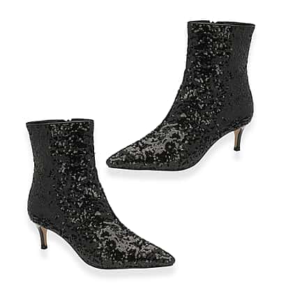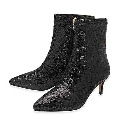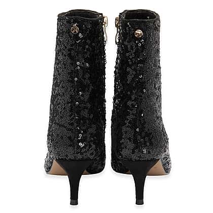 Made with a shimmering sequin finish, these ankle boots bring a bold, party-ready look that stands out. The sleek pointed toe and lifted heel shape create a refined silhouette, while the soft inner lining adds comfort for longer wear. The inside zip allows an easy slip-on feel without disrupting the smooth outer design. Each step catches the light, giving the boots a striking shine perfect for evenings out. This pair offers a stylish blend of sparkle, structure and comfort for statement dressing.