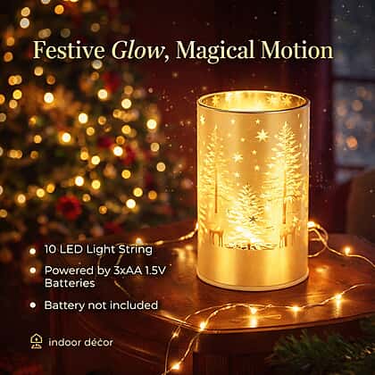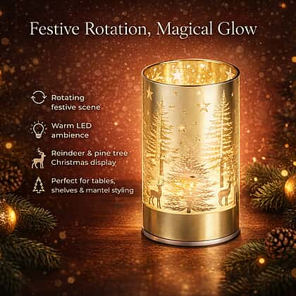 Create a soft festive glow with this rotating LED Christmas table lamp, finished in a warm gold tone for a refined seasonal look. The cylindrical design features a delicate reindeer and pine tree scene that gently rotates, adding subtle movement and visual interest when illuminated. Warm LED lighting enhances the cut-out detailing, casting a cosy glow across nearby surfaces. Well suited to tables, shelves, or mantel displays, this lamp brings a calm festive atmosphere without overwhelming the space. A decorative accent designed to add warmth and quiet charm to Christmas interiors.
