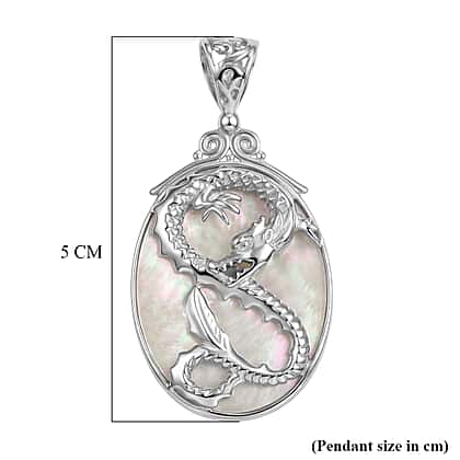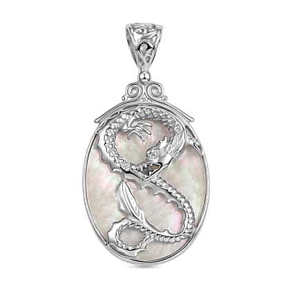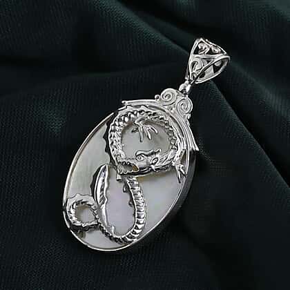 Admire the design showcased in this pendant from the Royal Bali Collection, where a finely carved dragon motif is rendered in sterling silver over a luminous mother of pearl base. The composition captures the coiled movement of the dragon, with intricately defined scales and flowing contours that create depth within the oval frame. The soft iridescence of the mother of pearl subtly shifts with light, enhancing the contrast against the polished silver carving. The balanced structure is further refined with an ornate bail that complements the overall detailing. Thoughtfully crafted, this piece reflects precision in carving and a strong visual identity, making it suitable for both everyday styling and more distinctive occasions.