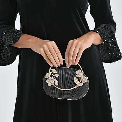 Ruched Crystal Flower Embellished Clutch Bag with Gold Handle - Black