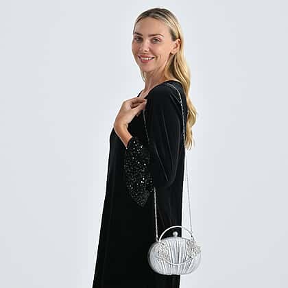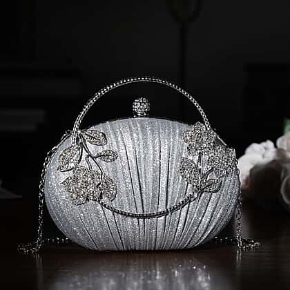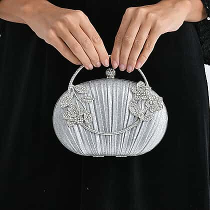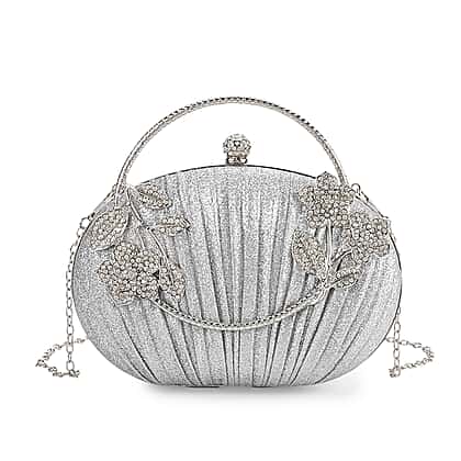 Adding this silver ruched crystal flower clutch to your outfit gives you a polished finishing touch that feels effortlessly special. Its metallic leatherette exterior is shaped with soft pleats and decorated with bright crystal floral details for a refined sparkle. The silver handle offers a chic hand-carry option, while the detachable 120cm chain strap gives you versatility for events where you prefer to stay hands-free. Inside, a neat polyester lining and slip pocket help keep essentials tidy. Measuring 19.8x4x13cm, it’s perfectly sized for an evening out.