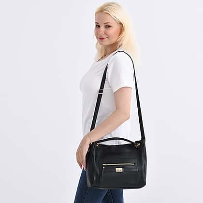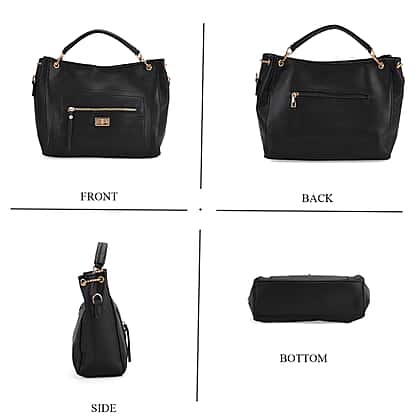 Graceful and chic, this satchel handbag makes for a functional and stylish option. Made with high-quality PU leather, it exudes a rich, smooth leather-like finish. It comes with adjustable straps that easily allows it to double up as a single-shoulder bag or crossbody bag. This black bag features polyester inner lining and entails one front pocket and a back pocket for quick access. In addition to this, it also features one zipper pocket inside and 2 slip pockets, perfect to carry your laptop, clips, accessories, keys, etc. This bag also has a seasonless allure, which means it can just be worn at any time of the year.